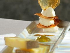 Réaliser un millefeuille en alternant crème de Comté et chips de pomme de terre. Disposer le jus au Comté et au curry et servir.