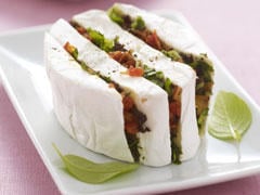 Intercaler entre chaque tranche la purée de tomates confites, un peu de tapenade et du basilic.