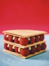 Suggestion de présentation : décorer le dessus du dernier éventail avec une framboise et accompagnez ce dessert d'un coulis de framboises.