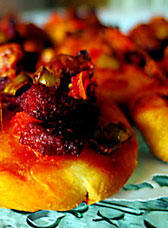 Découper dans la pâte à pizza 18 ronds à l'aide d'un emporte pièce ou d'un verre de 5 cm de diamètre et les poser sur une plaque anti-adhésive allant au four.