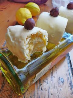 Mini-roulés au lemon curd et huile d'olive enrobés de chocolat blanc