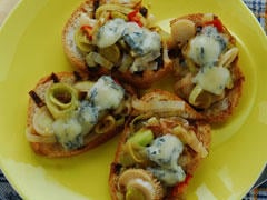 Disposer sur les tranches de pain une cuillère du mélange champignons/oignons ainsi que 2 dés de fromage.