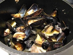 Mélanger et couvrir le temps que les moules s'ouvrent.