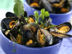 Pour les moules, ne conserver qu'une coquille dans laquelle on pose la moule cuite. Verser dessus la vinaigrette en répartissant bien les herbes.
