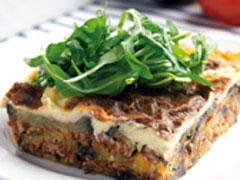 9. Déposer la sauce béchamel sur toute la surface de la Moussaka, puis mettez le fromage râpé et 3 noix de beurre.
