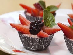 Avant de servir, disposer quelques morceaux de fraises, une feuille de menthe et une mûre sur chaque mousse.