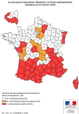 C'est pourquoi les régions où l'insecte est présent et se multiplie "sont classées au niveau 1 du plan national anti-dissémination du chikungunya, de la dengue et du Zika", indique le ministère de la Santé. Parmi les départements infestés par le moustique-tigre, aucun n'a réussi à faire diminuer sa population, ni à s'en débarrasser.