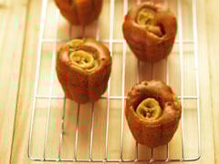 Répartir une tranche de banane dans le fond de chaque moule, déjà beurré et fariné, puis l’appareil, au tiers seulement, déposer un caramel et recouvrir de pâte. Les moules doivent être remplis aux trois-quarts.