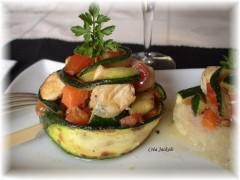 Il ne reste plus qu’à dresser l’assiette:faire un cercle avec les bandes de courgettes tenues par des pics en bois et les remplir de purée de céleri, puis des légumes avec le poulet.