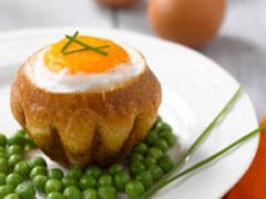 Evider les brioches de moitié.Placer au fond de chaque cavité une cuillère à café de crème épaisse, saler, poivrer,ajouter des petits brins de ciboulette.Casser un oeuf dans chacune des petites brioches, saler et poivrer de nouveau.Placer les brioches dans un plat allant au four et une feuille d’aluminium au‐dessus des brioches.Enfourner pour 10 minutes environ; un peu avant la fin, replacer au dessus des brioches leurs petits chapeaux.Pendant ce temps, cuire les petits pois dans de l’eau salée bouillante une dizaine de minutes – les égoutter.Disposer chaque petit nid sur assiette. Présenter autour les petits pois et décorer avec des brins de ciboulette.