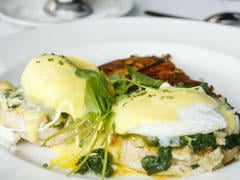 Poser une tranche de bacon sur un muffin et mettre l’oeuf poché par dessus. Ajouter la sauce sur l'oeuf.