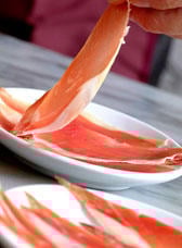 Faire revenir à feu vif le jambon Serrano coupé en petits morceaux et les champignons émincés, avec de l'huile d'olive.
