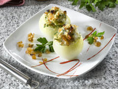 Une fois les oignons cuits, les garnir de cette préparation et servir.