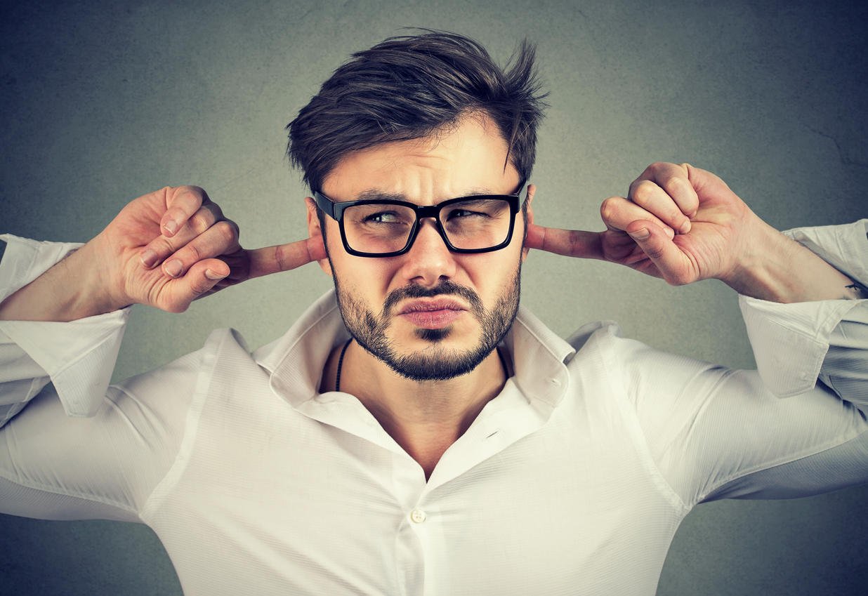young displeased man frowning and looking away while closing ears in irritation on gray background