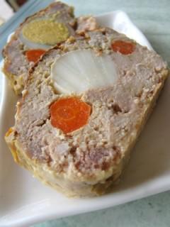 Dans un plat à terrine tasser la moitiée de la farce, disposer les oeufs durs au milieu, et les carottes sur les cotés, recouvrer de farce et enfourner 30 à 40 min.