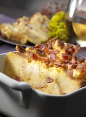 Environ un kg de pain rassis, 75 cl de lait, 50 g de beurre fondu au bain-marie, 250 g de Beaufort râpé, Sel, poivre et muscade, 4 œufs, 2 cuillère à soupe de crème fraîche, 150 g de lardons.