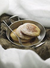 Faites fondre une noisette de beurre dans une poêle à blinis, versez-y une petite louche de pâte et laissez cuire à feu doux. Lorsque de petites bulles apparaissent à la surface du pancake, retournez-le et poursuivez la cuisson une minute de l'autre côté. Servez les pancakes tièdes ou chauds, saupoudrés de sucres aux épices.