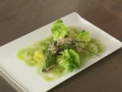 Pannequets de saumon et laitue aux 5 épices, émincé de tomates vertes