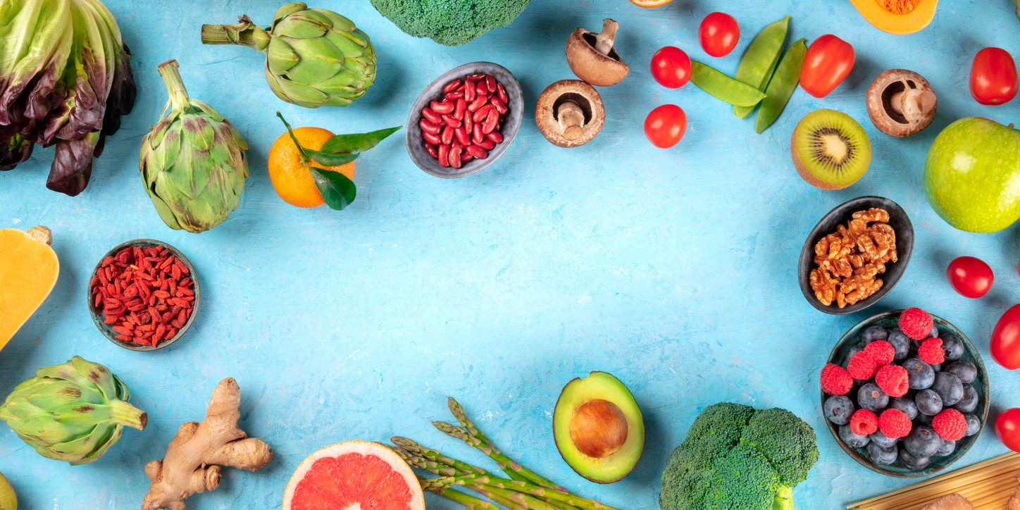 vegan food panorama, healthy diet background fruits, vegetables, nuts, legumes, mushrooms, shot from the top, forming a frame with copy space a flat lay design template