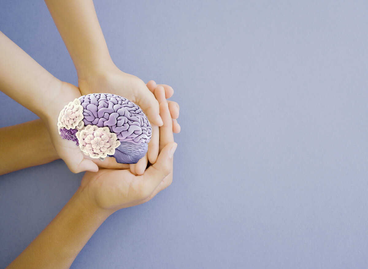 hands holding purple brain paper cutout, epilepsy and alzheimer awareness, seizure disorder, world mental health day concept