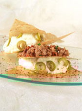 Parmentier de thon en millefeuille à la purée aux olives