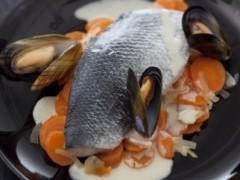 Pavé de bar au jus de coquillages, carottes et oignons des Cévenne