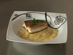 Pavé de bar juste saisi, purée de patates douces au gingembre et coriandre