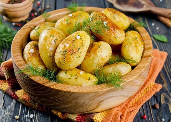 jeunes pommes de terre rôties à l'aneth dans un bol en bois