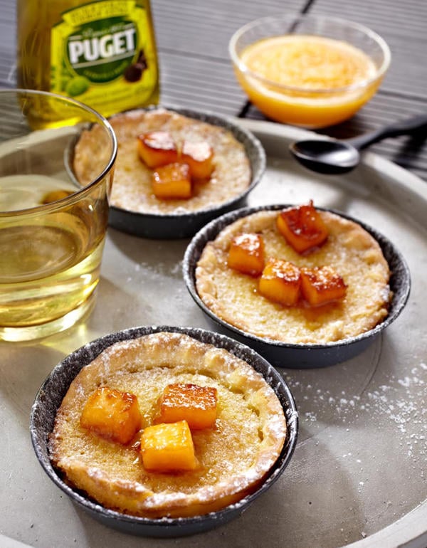 Dans un bol, mélangez rapidement : oeufs, sucre, rhum, jus et zestes des citrons, l’huile d’olive Puget classique et le beurre fondu.