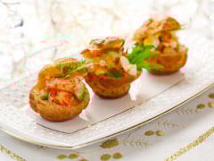 Dans chaque chou, déposer une petite cuillère de fromage au concombre puis un mélange de crevettes et saumon.