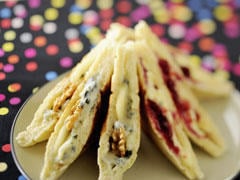 Etaler sur deux pains le mélange de gorgonzola et de noix et répartir l'autre préparation dans les deux derniers. Etaler une cuillère de confiture de fraise.