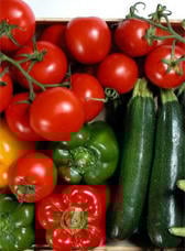 2 courgettes, 2 tomates, 2 pommes de terre, 4 à 6 merguez, 1 poivron, huile d'olive, sel, poivre, piment doux.