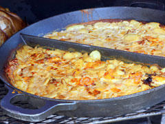 Faire chevaucher des rondelles de pommes de terre, préalablement lavées et épluchées, au fond d'une poêle à paella. Saler, poivrer et parsemer d'ail finement coupé.