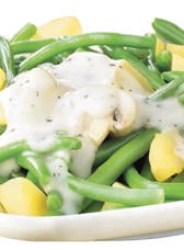 Eplucher et découper en cubes les pommes de terre, émincer les champignons. Cuire tous les ingrédients à la vapeur puis égoutter. Napper les légumes d'une barquette de sauce fromagère Weight Watchers® chauffée 1 minute au micro-ondes.