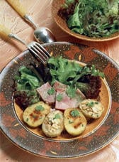 500g de pommes de terre nouvelles, 100g d'amandes effilées, 50g de beurre, paprika, 250g de mesclun, 4 tranches de jambon persillé, 1 petit bouquet de ciboulette.