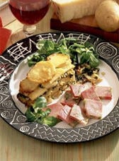 4 tranches de lard, 2 bananes (à flamber), 4 pommes de terre cuites et bien fermes, 4 belles poignées de mâche, 1 bon verre de pecket (genièvre), 1 trait d'huile d'olive, sel et poivre.