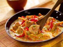 Faire dorer le poulet et les légumes, préalablement découpés, à feu vif.