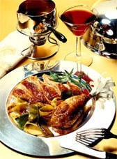 Le poulet cuit, le retirer du plat que vous dégraissez, puis porter sur le feu avec 1/2 dl d'eau chaude et le jus de truffes. Mélanger bien jusqu'à dissolution des sucs et servir ce jus en saucière.