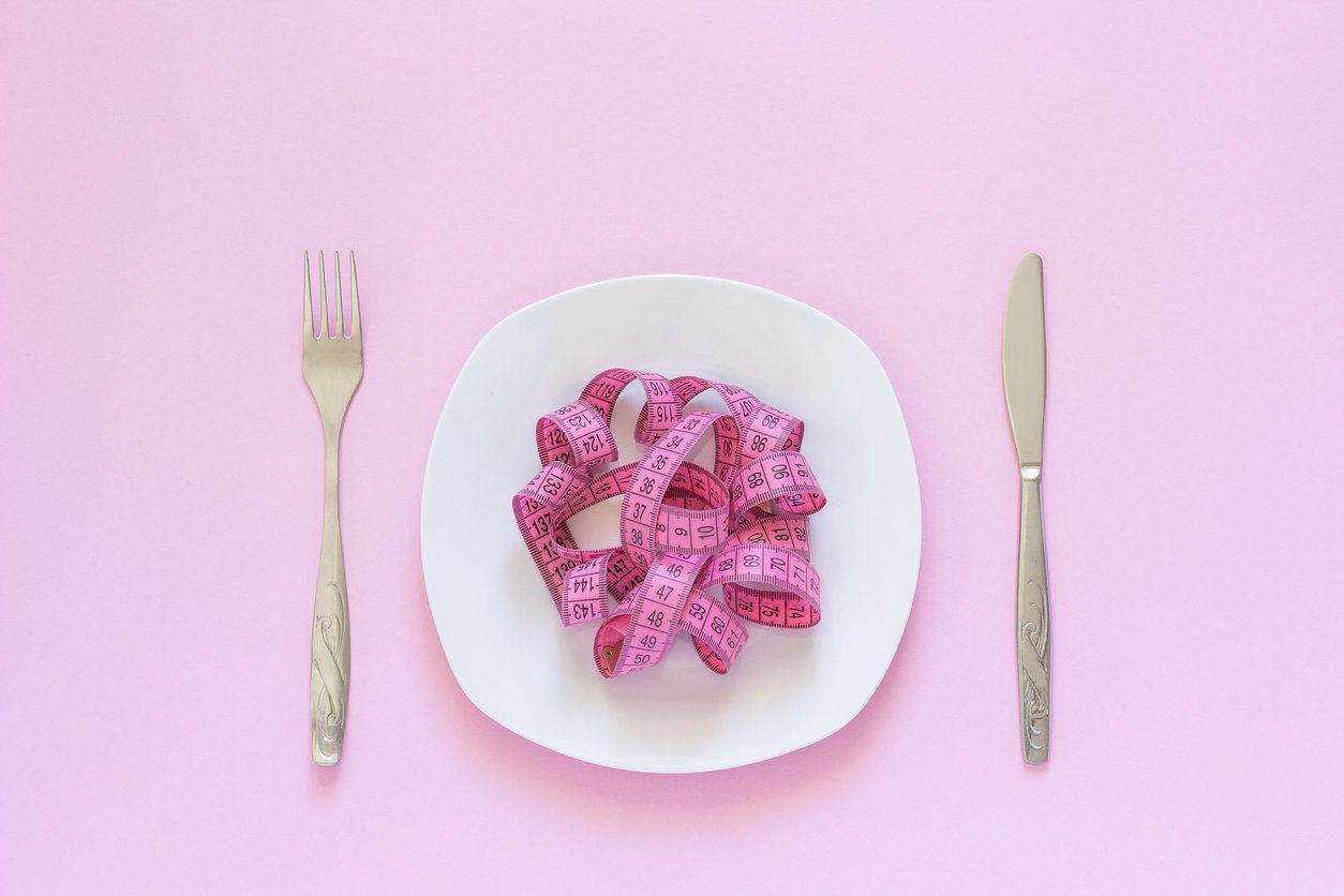 pink measuring tape lying on plate in the form of spaghetti, knife and fork on pink background diet or anorexia concept top view