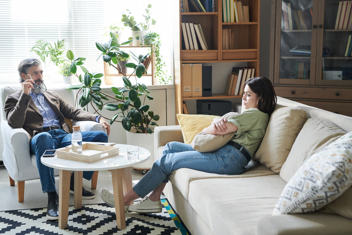 melancholic young woman sitting on sofa hugging pillow sharing her thoughts to psychologist during therapy session