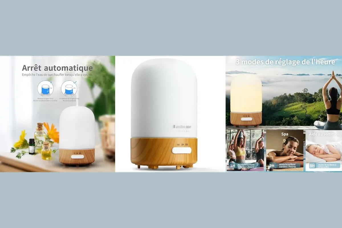 "Le diffuseur d'huiles essentielles Fashome 100ml en verre adopte une plaque ultrasonique de haute qualité avec une fréquence de 2,400,000 cycles/seconde qui décompose les molécules d'eau en un brouillard microscopique qui aide à être facilement absorbé par les poumons pour un plus grand effet thérapeutique." - Description de l'éditeur.