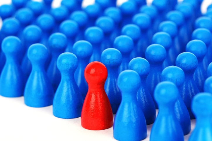 one red pawn game figure standing out in a row with many blue pawn game figures