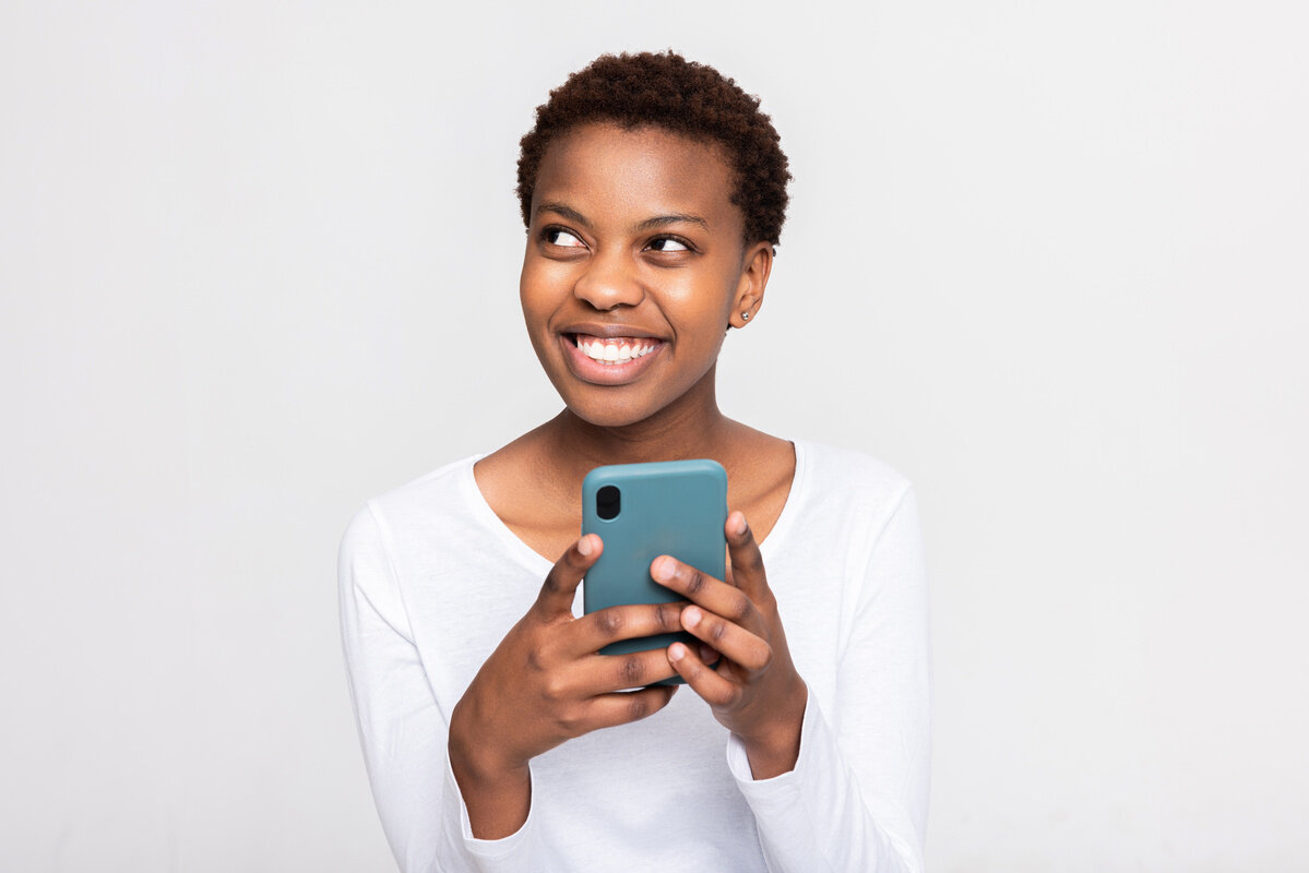 charming african woman with short haircut holding cellphone in hands chatting messaging with someone boyfriend friends family holding new modern device in arms