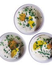 4 cuil. à café de moutarde, 4 cuil. à soupe de crème fraîche, 4 pincées de curry, 4 œufs, 4 cuil. à café de crème fraîche, sel, poivre.