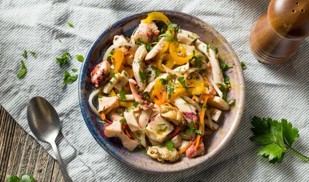 Lavez et essorez la salade. Effeuillez-la et ciselez grossièrement les feuilles. Rincez les tomates et le poivron, épépinez-les et coupez-les en dés. Mettez le tout dans un saladier, et ajoutez le calamar refroidi. Lavez les herbes, et ciselez-les par-dessus la salade.