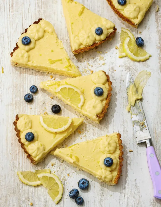 4. Préparez le crémeux citron : placez la gélatine dans de l’eau froide. Versez l’érythritol dans une casserole avec les zestes de citrons et les œufs. Mélangez bien au fouet, versez le jus de citron, puis laissez le mélange épaissir à feu très doux en fouettant régulièrement.