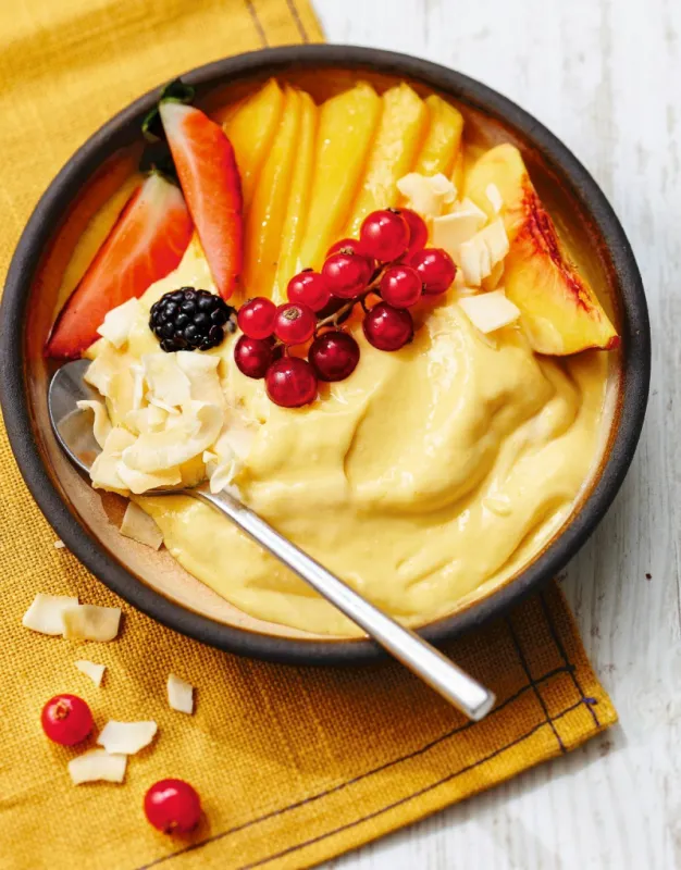 Pour la finition : quelques fruits frais (groseilles, kiwi, myrtilles, etc.) Copeaux de noix de coco