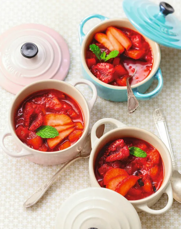 - Décorez avec des morceaux de fraises, des framboises et des feuilles de menthe.