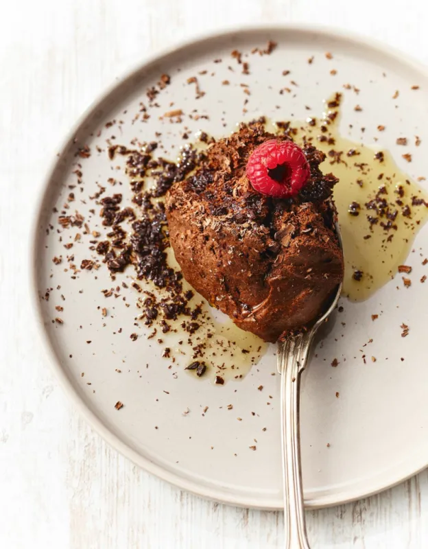 - Au moment de servir, placez une grande cuillerée de mousse dans une assiette à dessert, puis versez un petit filet d’huile d’olive, râpez un peu de chocolat dessus et ajoutez 1 pincée de fleur de sel.