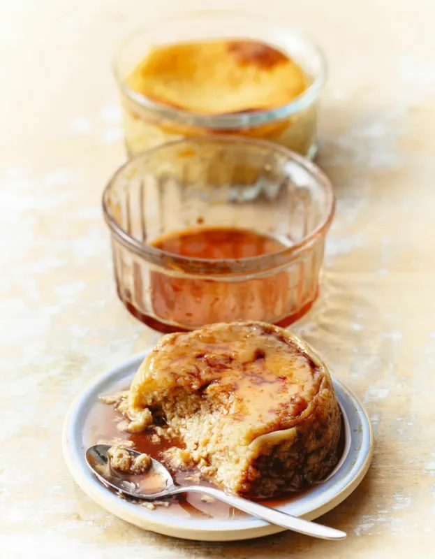 - Préchauffez le four à 160° C (th. 5-6). Versez la préparation dans les ramequins, sur le caramel, puis faites cuire au four, au bain-marie (versez de l’eau dans un plat avant d’y déposer les moules) pendant 1 h.